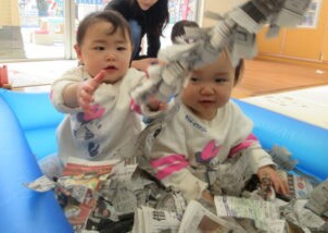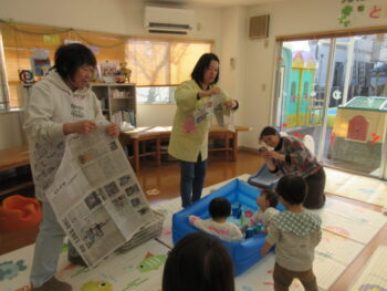 今回は新聞あそびをしました。小さいお子様たちは新聞自体になかなか触る機会がないかもしれませんね。