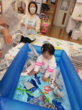 思い思いにぐしゃぐしゃにしたり豪快にビリビリしたりして思いっきり楽しみました。また、ビニールプールにちぎったり丸めた