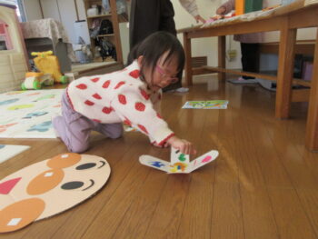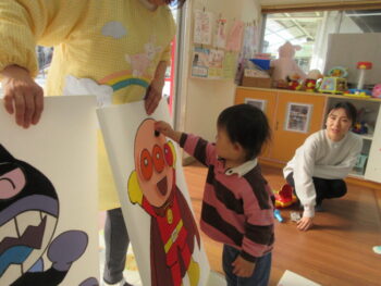 センター内ではアンパンマンキャラクターの福笑いや手作りコマをつくるコーナー、手作りパズル、親子でのゲームがあったりとそれぞれ楽しく過ごして頂きました。